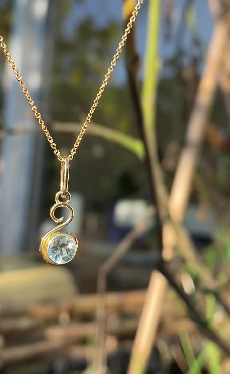At the heart of this pendant is a 5mm (~0.5 ct) genuine Aquamarine, ethically mined and cut in Brazil. Learn more about the stones I use here